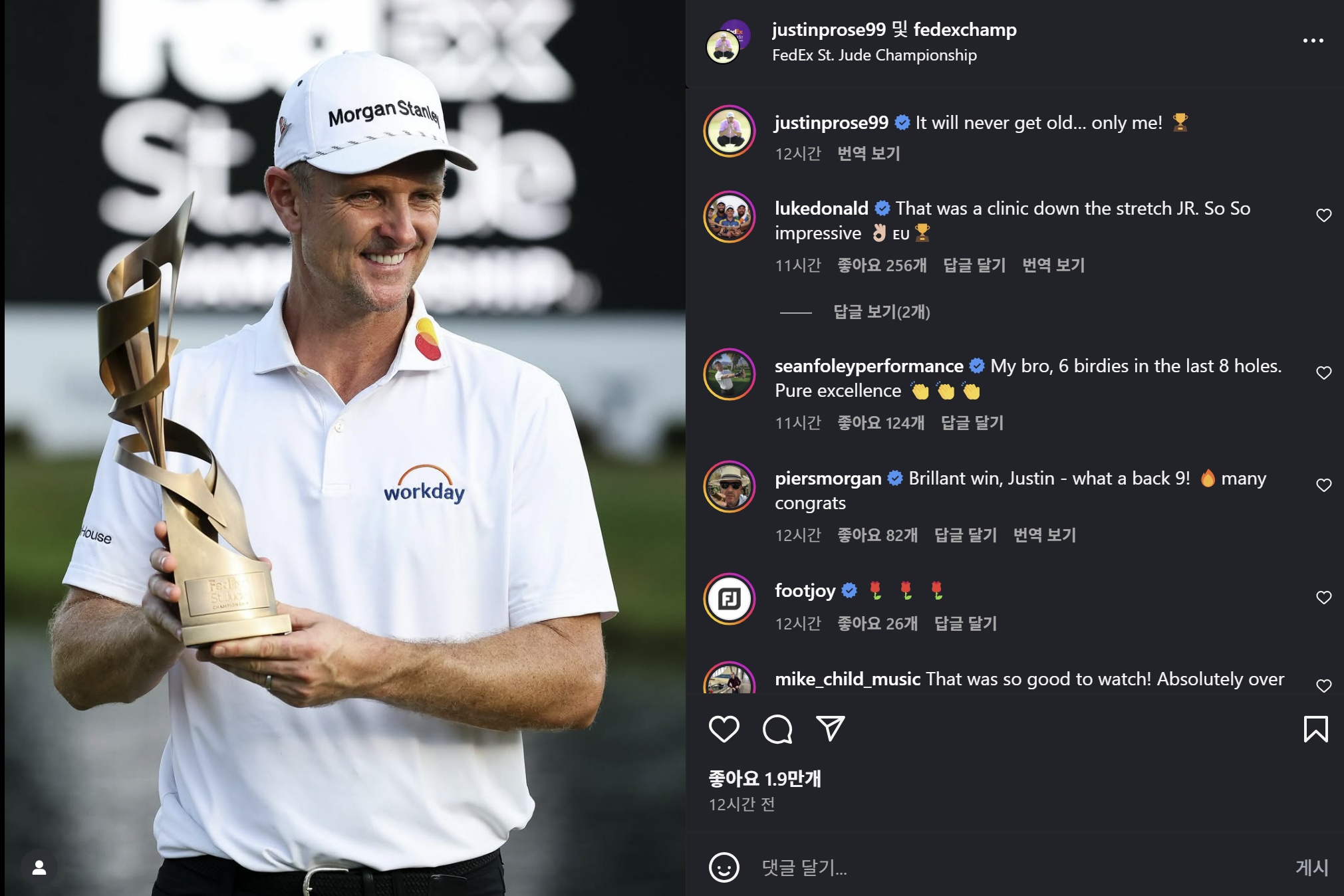 이번 우승으로 저스틴 로즈는 어마어마한 상금을 획득했습니다. 무려 360만 달러(약 50억원)의 우승상금을 거머쥐었으며, 페덱스컵 포인트 2000점을 받아 25위에서 4위까지 크게 도약했습니다!